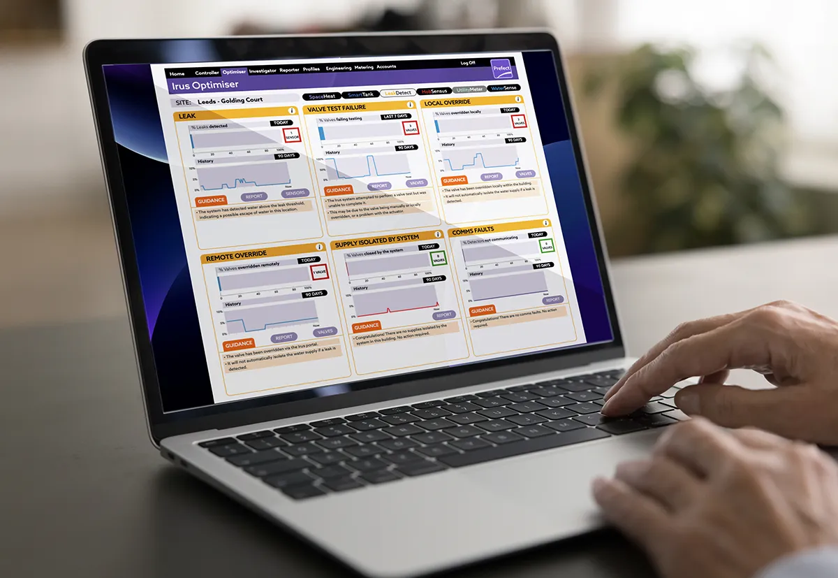 Using existing Irus infrastructure, LeakDetect identifies moisture or water ingress via discreet sensors or detection tape connected through the central control unit. When abnormal conditions are detected, alerts are immediately issued to designated teams via SMS and email. Crucially, Automatic Shut-Off Valves will remotely activate to isolate the affected area, limiting damage at room, flat, floor or block level. ‘Optimiser’ is the bespoke software tool that analyses data from the ecosystem and provides guidance, that when acted on, ensures Irus performs optimally.